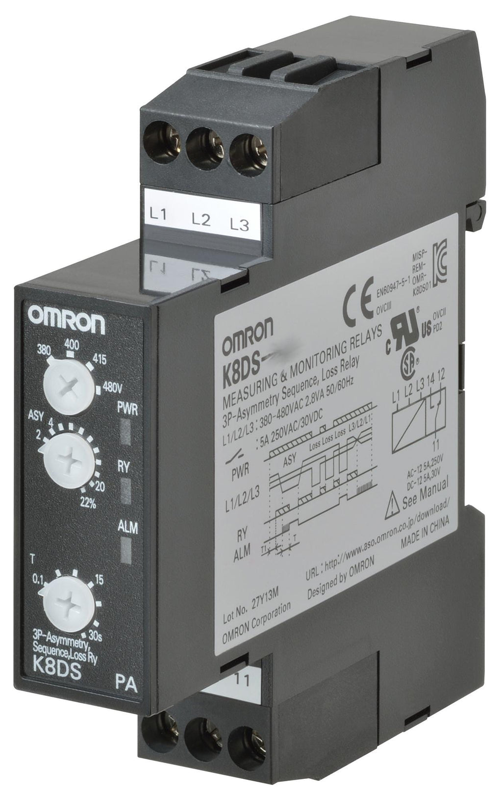 OMRON - K8DS-PA2 - Phase Monitoring Relay, K8DS-PA, SPDT, 5 A, DIN Rail, Screw, 250 VAC