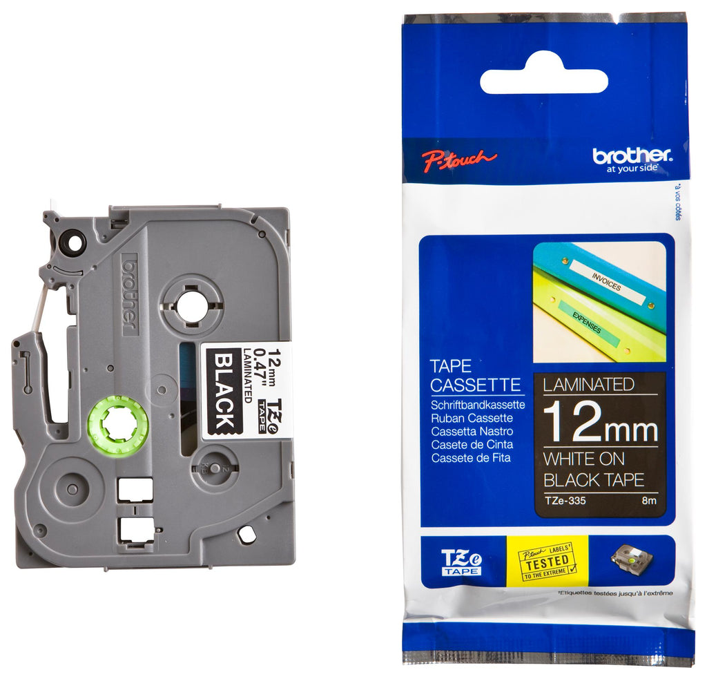 BROTHER - TZE-335 - Label Printer Tape, Adhesive-Laminated, White on Black, 8 m x 12 mm